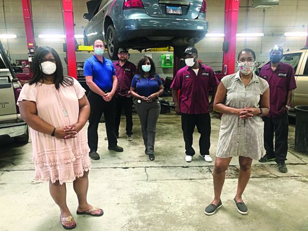 Kankakee, Ill., Mayor Chasity Wells Armstrong (left) and Ill. Lt. Gov. Juliana Stratton (right) visit with Auto-Lab franchisees Larry Fullmer and Wanda Lewis-Fullmer (in blue shirts) and staff.